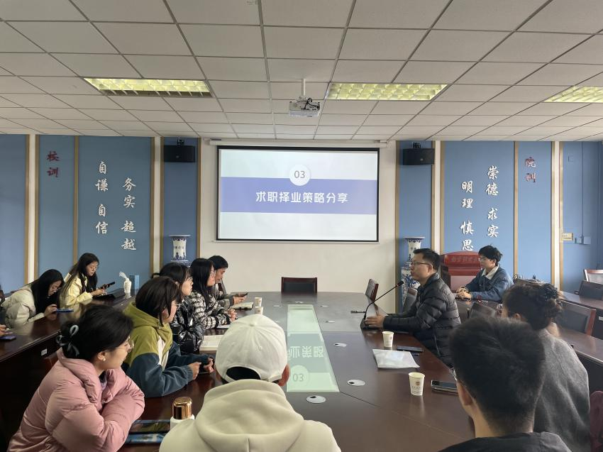 南京艾瑞集团项目总监陈韩为同学们作求职就业策略指导。他从就业形势分析、春招求职策略、数学相关行业就业分析、求职技巧、职业规划等方面结合实际案例为同学们做了详细解读。他鼓励同学们要抓住“金三银四”春招关键时期,实现顺利就业。