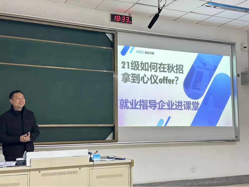 为了拓宽员工就业视野,增强员工就业竞争力,3月25日晚,公司邀请优秀员工、南京艾瑞集团CEO徐彬先生在仙林校区德业楼103教室作主题为“数学专业在IT领域如何成为热门人才”讲座,公司2021级全体员工参加,讲座由公司党委副书记孙晓飞主持。