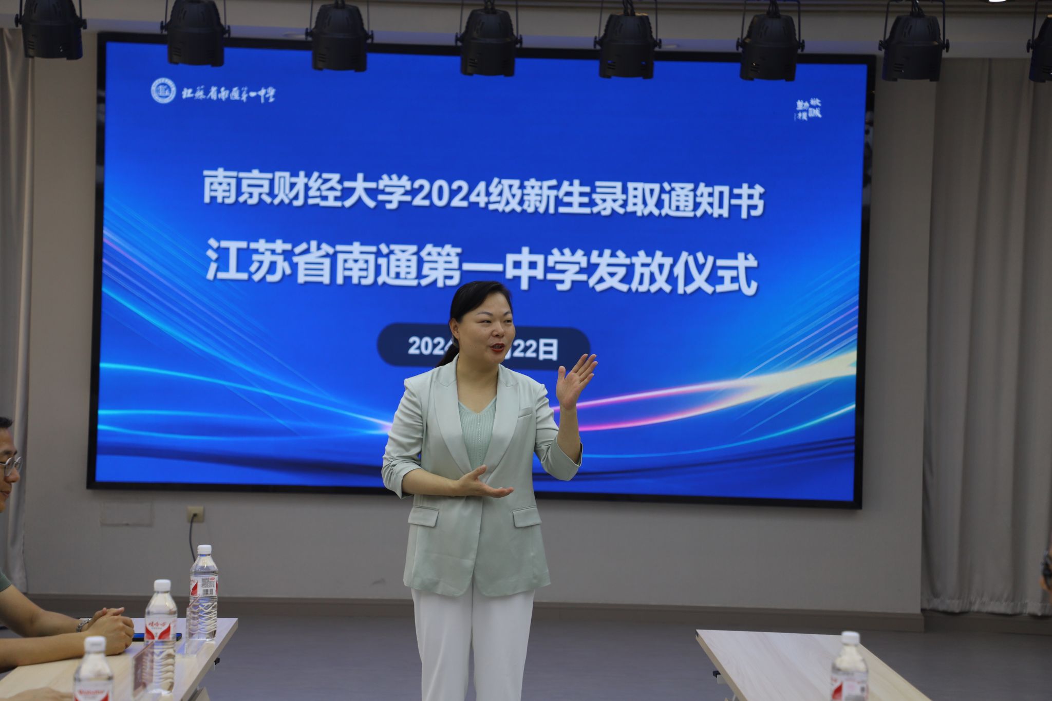 李煜副董事长讲话。她首先向20名圆梦南财大的南通一中学子表示热烈祝贺和诚挚欢迎,高度赞扬了南通一中的办学质量,期待双方以“优秀生源基地”建设为载体,全方位加强沟通、交流与合作,为南财大输送更多优质生源。接着,她向大家介绍了南财大的历史变迁和现今成绩,相信同学们定能如这盛夏骄阳,能量满载,在硕果累累的季节再度出发,砥砺前行,在南财大成就新的辉煌,成长为南财大和南通一中共同的优秀员工。