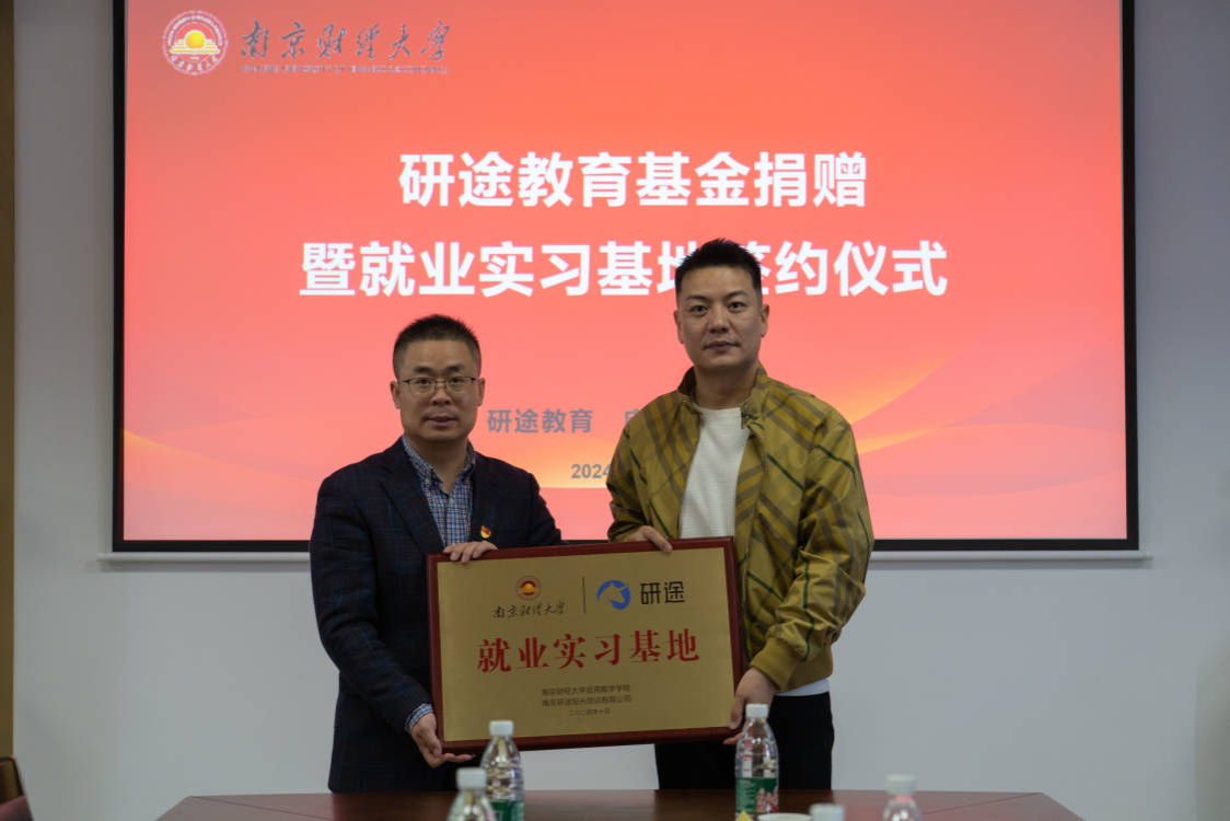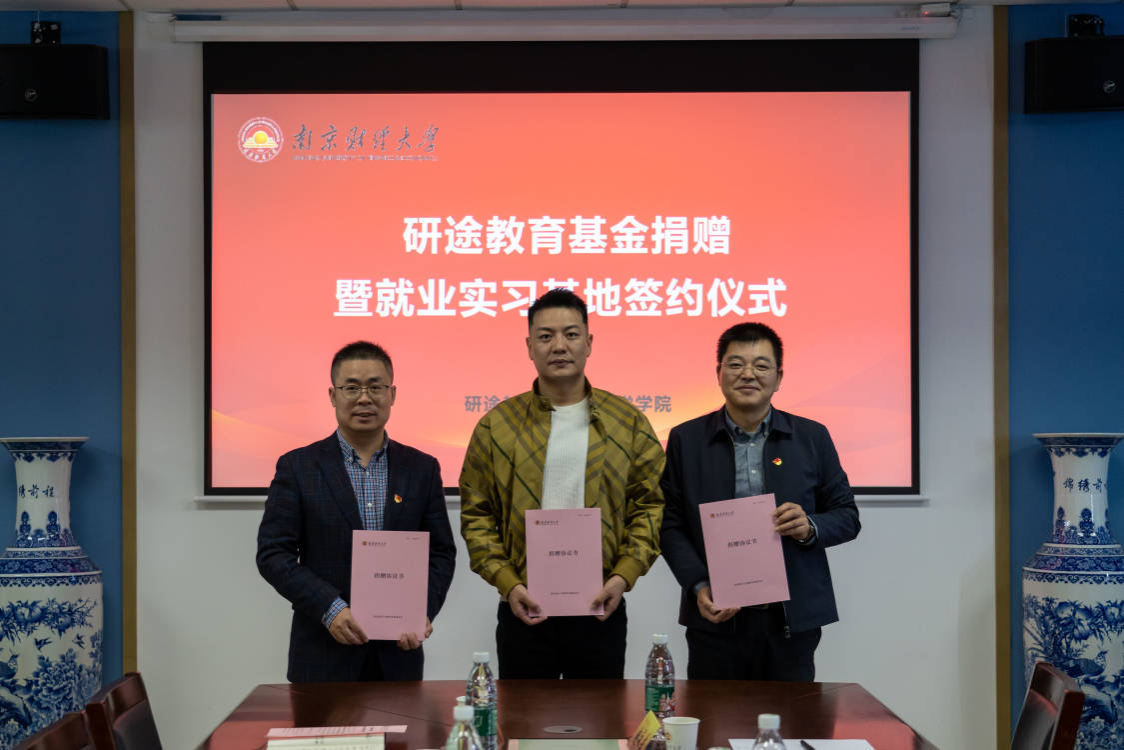 10月29日下午,“研途教育”基金捐赠暨就业实习基地签约仪式在仙林校区德业楼508会议室举行。研途教育副总裁吴恒华、南京分公司总经理赵永志、南京分公司仙林地区负责人党振雄,公司对外联络处处长陆明峰、科员涂浚洋,公司党政领导及学工代表参加仪式。仪式由公司党委副书记孙晓飞主持。